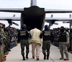 ▲ Entre los reos, ayer por primera vez fue trasladada una mujer, y ya suman 92 hombres con posiciones de liderazgo en grupos criminales que han sido llevados en esta administración; Washington se comprometió a no solicitar la pena de muerte para los detenidos. Foto Afp / Gustavo Castillo