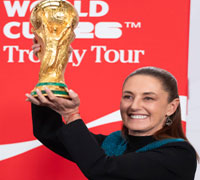 ▲ La presidenta Claudia Sheinbaum presentó el trofeo del Mundial de 2026. Yo sí puedo tocarlo, aclaró. Foto Presidencia