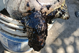 ◀ Desde el 2 de marzo se tiene el reporte de al menos 12 ejemplares de diversos tipos de animales marinos muertos, sin que haya un informe oficial de las causas. La presencia de hidrocarburo se ha extendido a lo largo de las costas, a pesar de que las autoridades han asegurado que el derrame está controlado. Imagen de una tortuga. Foto La Jornada. Iván Sánchez