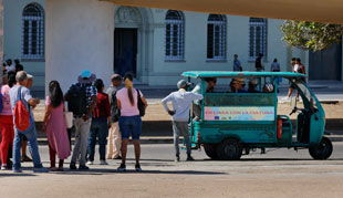 ▲ Ante la falta de gasolinas, habitantes de La Habana hacen filas para abordar taxis eléctricos, mientras proveedores estadunidenses han enviado unos 30 mil barriles de combustible para empresas privadas de la isla, lo que evidencia el plan de Washington de darles ventaja frente a las estatales. Foto Marco Peláez