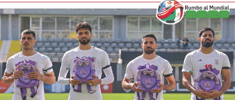 ▲ Los jugadores iraníes sostuvieron mochilas color morado durante la ceremonia de los himnos nacionales en su partido amistoso contra Nigeria, que se disputó en Turquía. El conjunto asiático recordó así a las víctimas del ataque aéreo del pasado 28 de febrero sobre una escuela en Minab, que dejó 165 muertos; la mayoría eran niñas. Foto Ap / Redacción