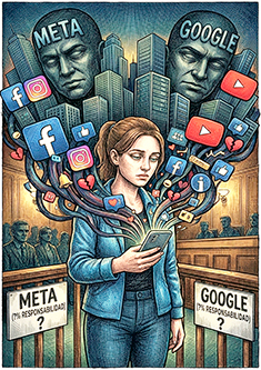 aley, la valiente joven de 20 años que supo el daño sufrido desde su niñez y adolescencia debido a la exposición y uso de plataformas digitales, demandó a Meta (Instagram/Facebook /Whatsapp) y a YouTube (Google/Alphabet) por causar un severo cuadro adictivo en su salud y en su desarrollo personal: depresión, angustia y dismorfia corporal. Un juzgado de Los Ángeles recién falló a favor de la demandante, imponiendo una multa de 3 millones de dólares y luego otros 3 millones adicionales, que tendrán que pagarle por indemnización (70 por ciento y 30 por ciento cada una), lo que es apenas una ínfima parte de las ganancias que anualmente aumentan dichas ciberempresas, que en gran parte vienen de la venta de publicidad que intoxica a los usuarios de dichas redes sociales.